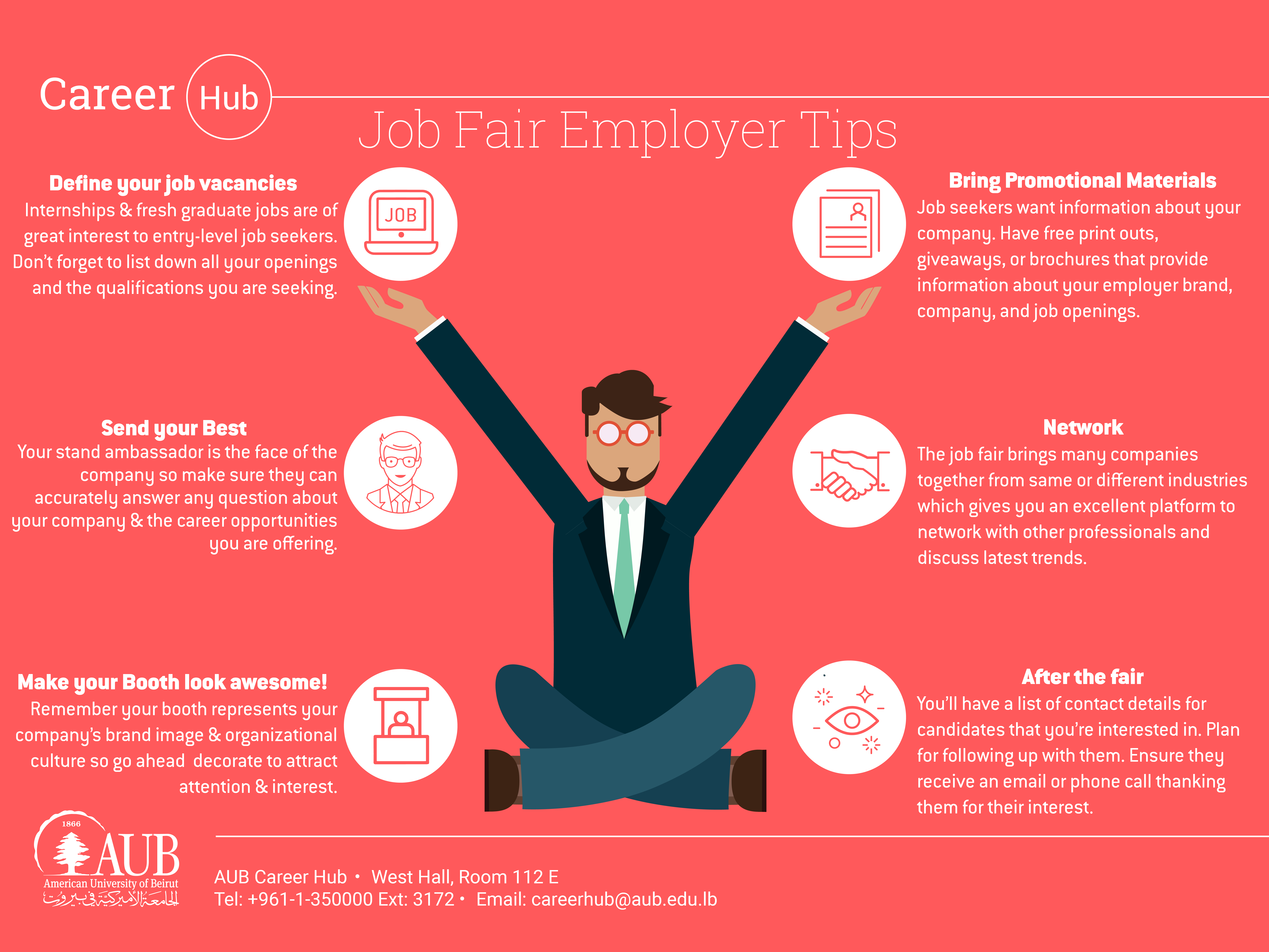 - Inform us ahead of time about your available vacancies for AUB students. The Career Hub team will assist you in promoting your organization among students and alumni.