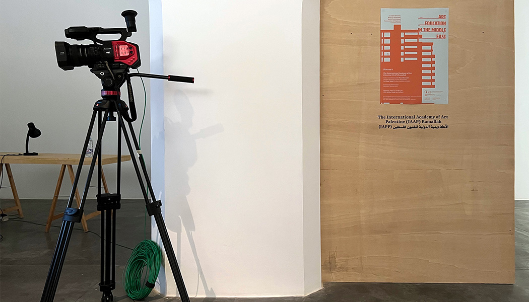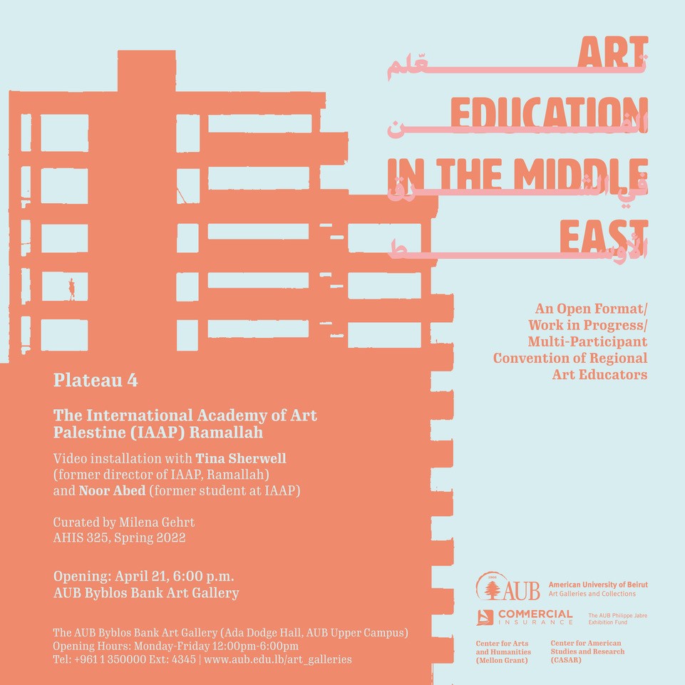 The Palestine Plateau consists of a two-screen video installation showing a talk by the former director of IAAP and a few samples of students work. In her recorded zoom lecture, the former director Tina Sherwell talks about the history of the academy, the process of instruction, the development of the curriculum, and the pedagogical methods drawing on archival material. Facing the talk by Tina Sherwell is a presentation of performance art and video works made by Noor Abed during her studies at the academy from 2011 to 2013.