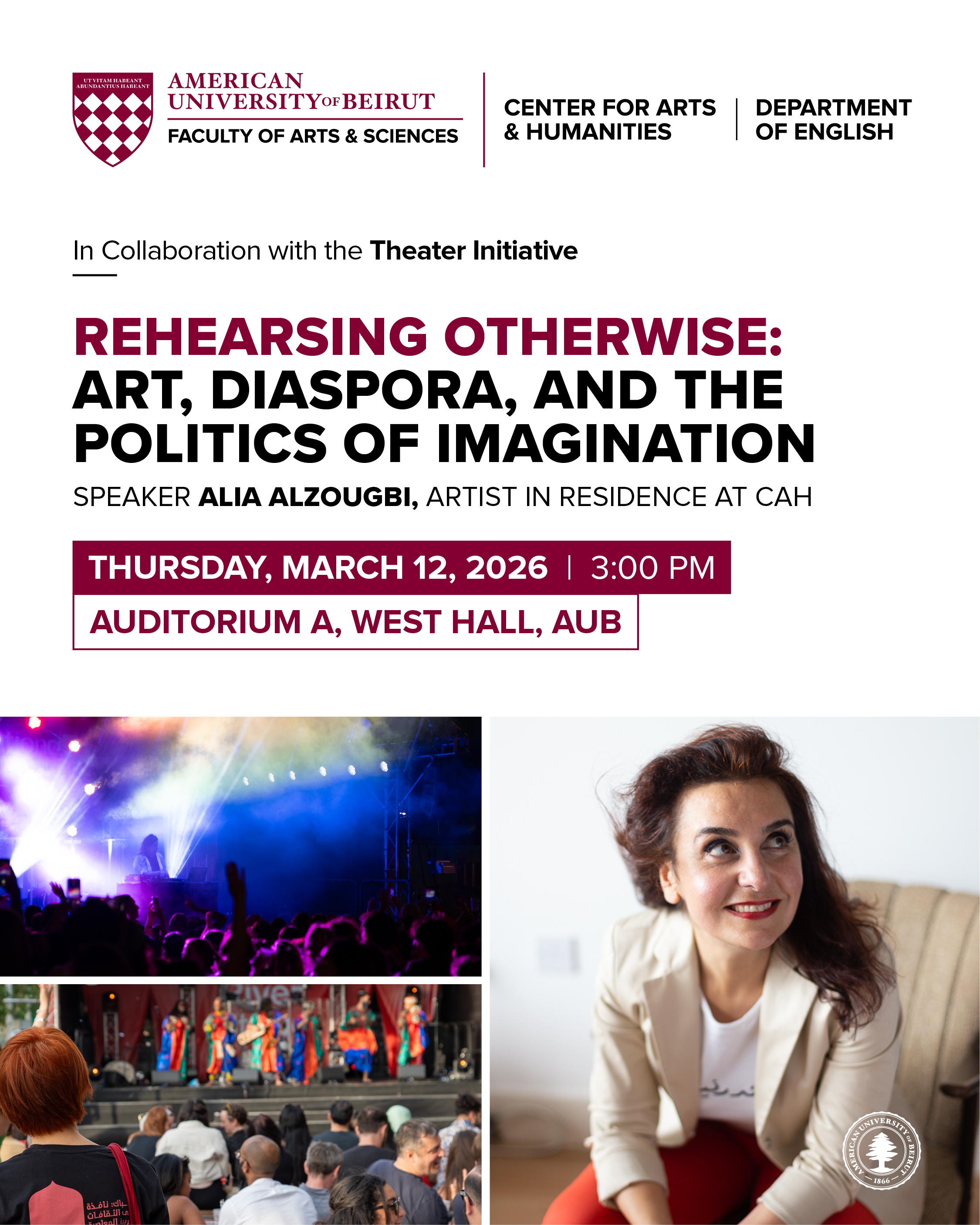 The Center for Arts and Humanities (CAH) at the American University of Beirut is pleased to announce a dynamic lineup of upcoming events that reflect its commitment to interdisciplinary research and teaching in the arts and humanities, scholarly exchange and collaboration, and outreach to broader publics both locally and globally.