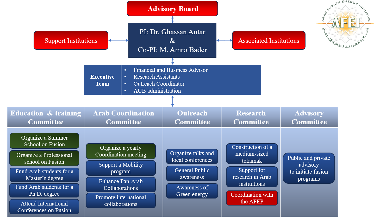 The organization scheme of the AFEI, where the PI and co-PI are helped by the Executive Team, is currently made up of volunteers. The PI and co-PI will report to the Advisory Board about the activities. They will also form a list of Associated Institutions, which are Arab institutions with whom work will be done. Another list of supporting institutions will be made, which are mainly international entities that agreed to help in one way or another with this initiative. The PI and co-PI will form five sub-committees that will write proposals and execute the different activities.