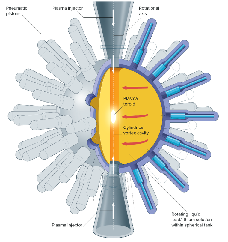 Fig. 7: Schematic of the magnetized target fusion configuration where plasma is injected from top and bottom and the confinement is driven by pneumatic pistons [17].