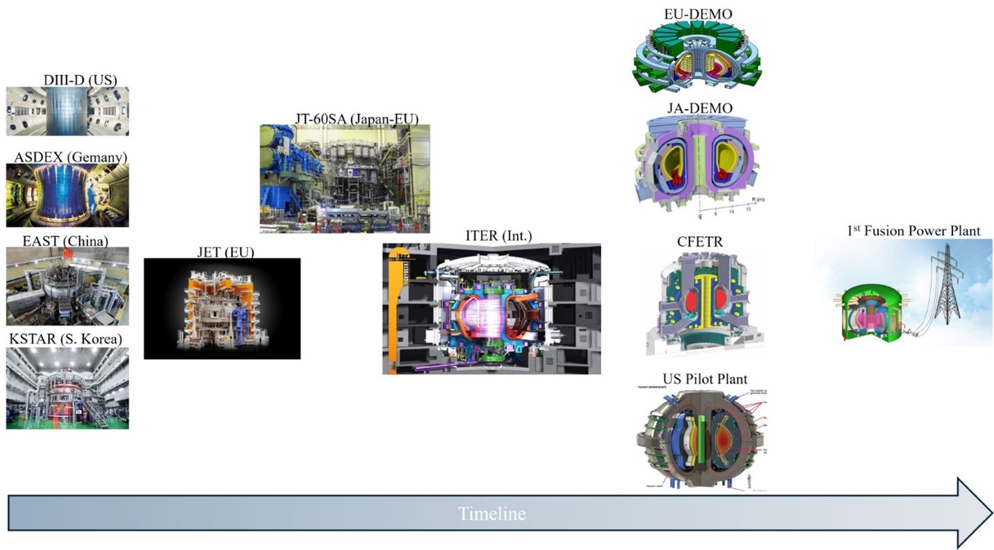 Fig. 9: Worldwide publicly-funded pathways from operational tokamak experiments and ITER to first-of-a-kind power plants. Designs are not to scale.