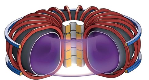 Fig. 3: A spherical tokamak is characterized by its small center stack and thus its compact shape [12]. The toroidal magnetic field is generated by toroidal coils and the plasma current produces the poloidal magnetic field as in a 'normal' tokamak.