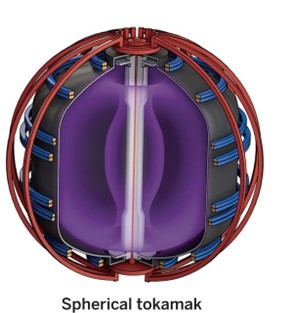 A noteworthy variation of the tokamak is the Spherical Torus (ST), which features a much smaller central stack, resulting in a more compact, 'spherical' design. This configuration seeks to enhance confinement efficiency while reducing both the size and cost of fusion devices. An ST layout is shown below.