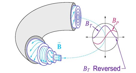 Fig. 4: The RFP configuration is characterized by the absence of toroidal magnets, both poloidal and toroidal magnetic fields are produced by a current in the plasma. [13]
