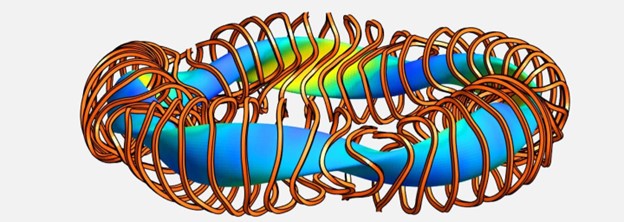 Fig. 2: A generic layout of a stellarator concept, showing the plasma in blueish colors and magnetic coils twisted shape in reddish colors.