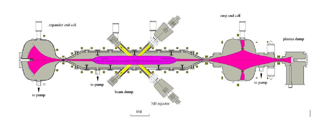 Fig. 6: Basic magnetic mirror machine using two neutral beam (NB) injectors and an axial non-uniform magnetic field. [15]