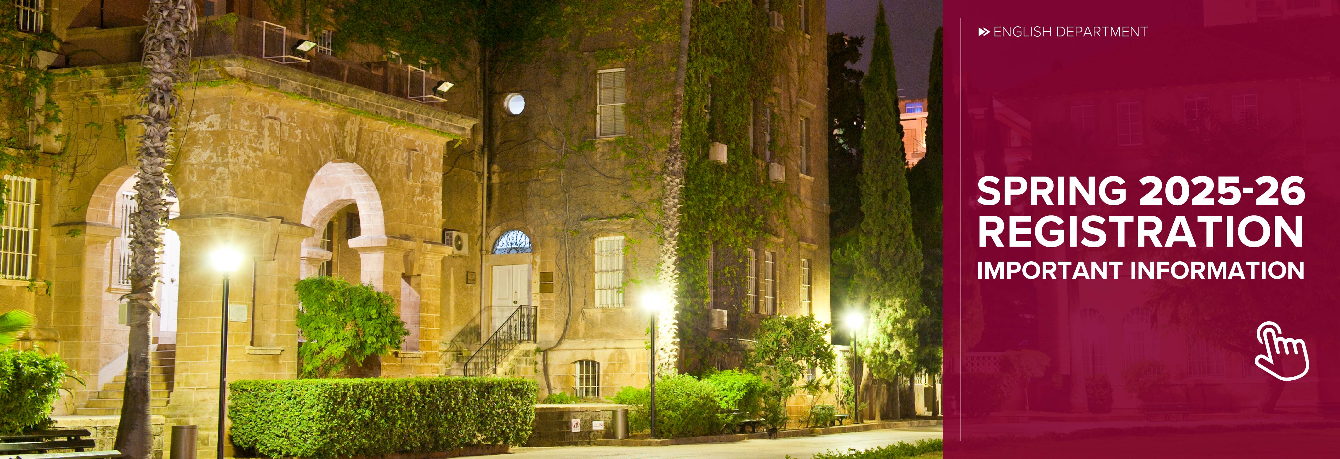 The Department of English offers B.A. degree programs in Language and Literature, and minors in four areas: Language, Literature, Creative Writing, and Gender Studies. In addition, it offers three Minors in collaboration with other departments and programs at AUB: a Minor in Translation with the Department of Arabic and Near Eastern Languages, a Minor in Theater with the Department of Fine Arts and Art History and the Civilization Studies Program, and a Minor in Film and Visual Culture with the Media Studies Program of the Department of Sociology, Anthropology and Media Studies.