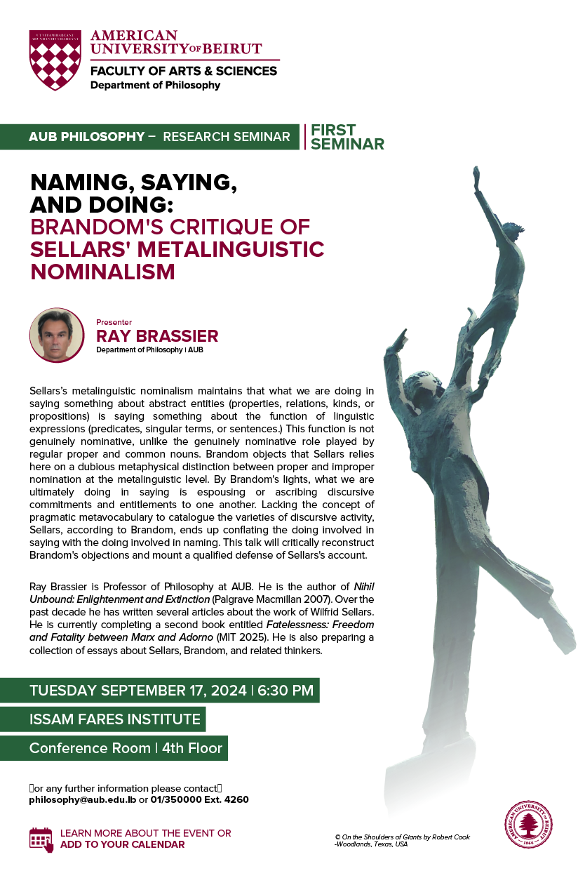 Ray Brassier is Professor of Philosophy at AUB. He is the author of Nihil Unbound: Enlightenment and Extinction (Palgrave Macmillan 2007). Over the past decade he has written several articles about the work of Wilfrid Sellars. He is currently completing a second book entitled Fatelessness: Freedom and Fatality between Marx and Adorno (MIT 2025). He is also preparing a collection of essays about Sellars, Brandom, and related thinkers.