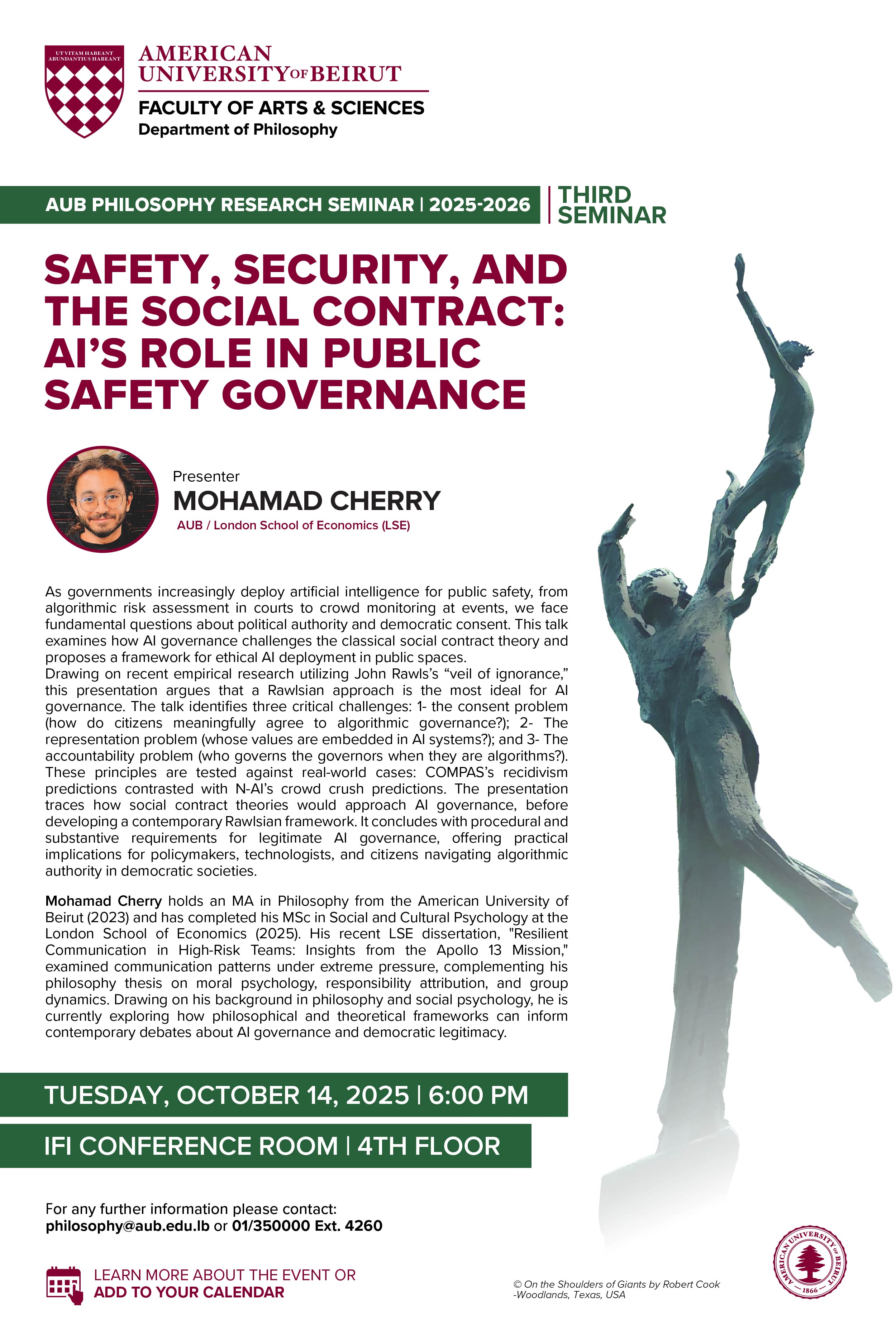 As governments increasingly deploy artificial intelligence for public safety, from algorithmic risk assessment in courts to crowd monitoring at events, we face fundamental questions about political authority and democratic consent. This talk examines how AI governance challenges the classical social contract theory and proposes a framework for ethical AI deployment in public spaces. Drawing on recent empirical research utilizing John Rawls’s “veil of ignorance,” this presentation argues that a Rawlsian approach is the most ideal for AI governance. The talk identifies three critical challenges: 1- the consent problem (how do citizens meaningfully agree to algorithmic governance?); 2- The representation problem (whose values are embedded in AI systems?); and 3- The accountability problem (who governs the governors when they are algorithms?). These principles are tested against real-world cases: COMPAS’s recidivism predictions contrasted with N-AI’s crowd crush predictions. The presentation traces how social contract theories would approach AI governance, before developing a contemporary Rawlsian framework. It concludes with procedural and substantive requirements for legitimate AI governance, offering practical implications for policymakers, technologists, and citizens navigating algorithmic authority in democratic societies.