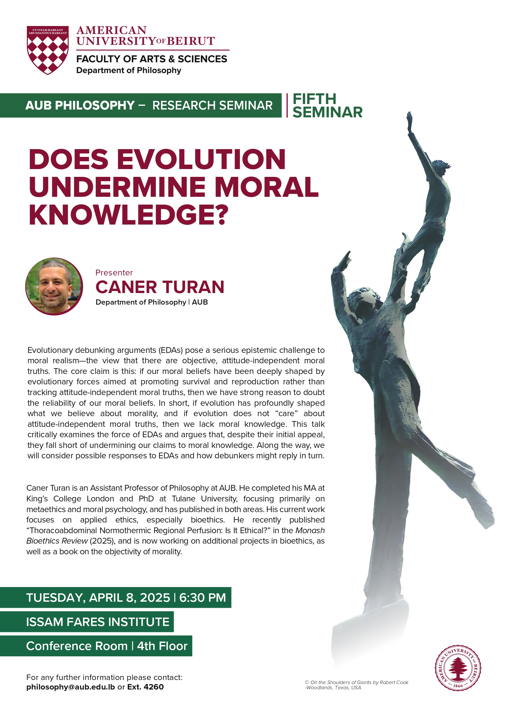 Evolutionary debunking arguments (EDAs) pose a serious epistemic challenge to moral realism—the view that there are objective, attitude-independent moral truths. The core claim is this: if our moral beliefs have been deeply shaped by evolutionary forces aimed at promoting survival and reproduction rather than tracking attitude-independent moral truths, then we have strong reason to doubt the reliability of our moral beliefs. In short, if evolution has profoundly shaped what we believe about morality, and if evolution does not “care” about attitude-independent moral truths, then we lack moral knowledge. This talk critically examines the force of EDAs and argues that, despite their initial appeal, they fall short of undermining our claims to moral knowledge. Along the way, we will consider possible responses to EDAs and how debunkers might reply in turn.
