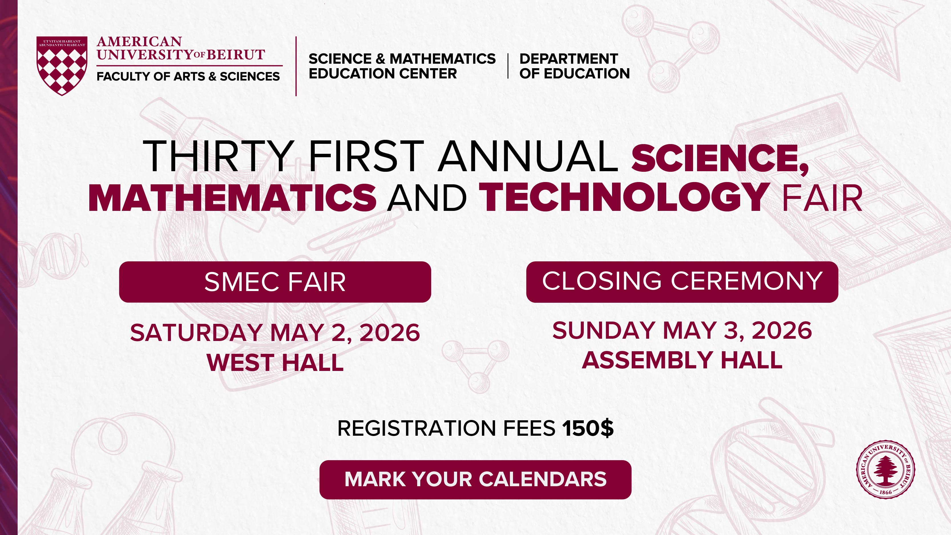 The Science and Mathematics Education Center (SMEC) within the Department of Educationis organizing the Thirty-First Annual Science, Mathematics, and Technology Fair on the weekend of May 2 and May 3, 2026, at the American University of Beirut. The Fair provides students from schools throughout Lebanon with the opportunity to share scientific, mathematical, and technological projects with their peers from other schools. |