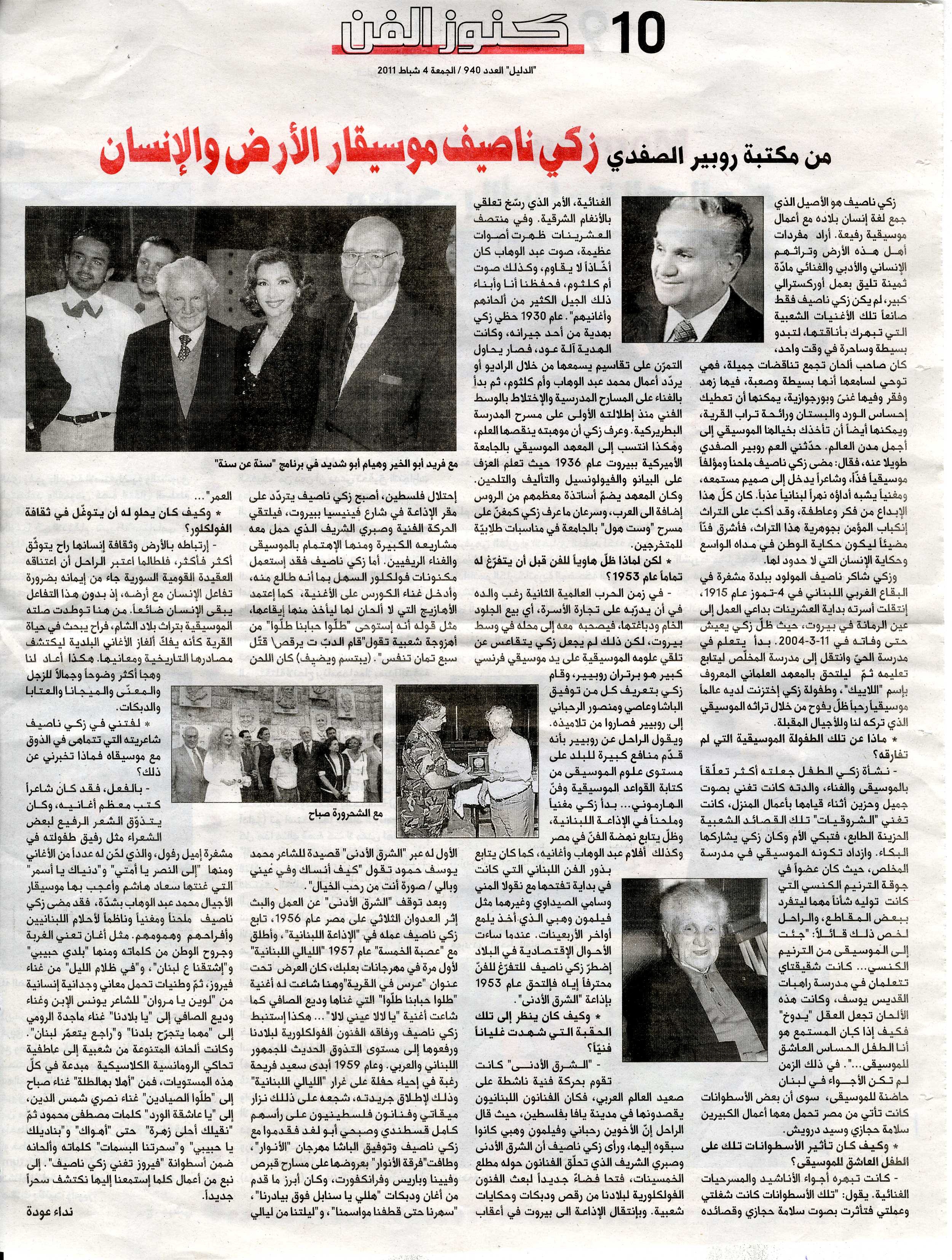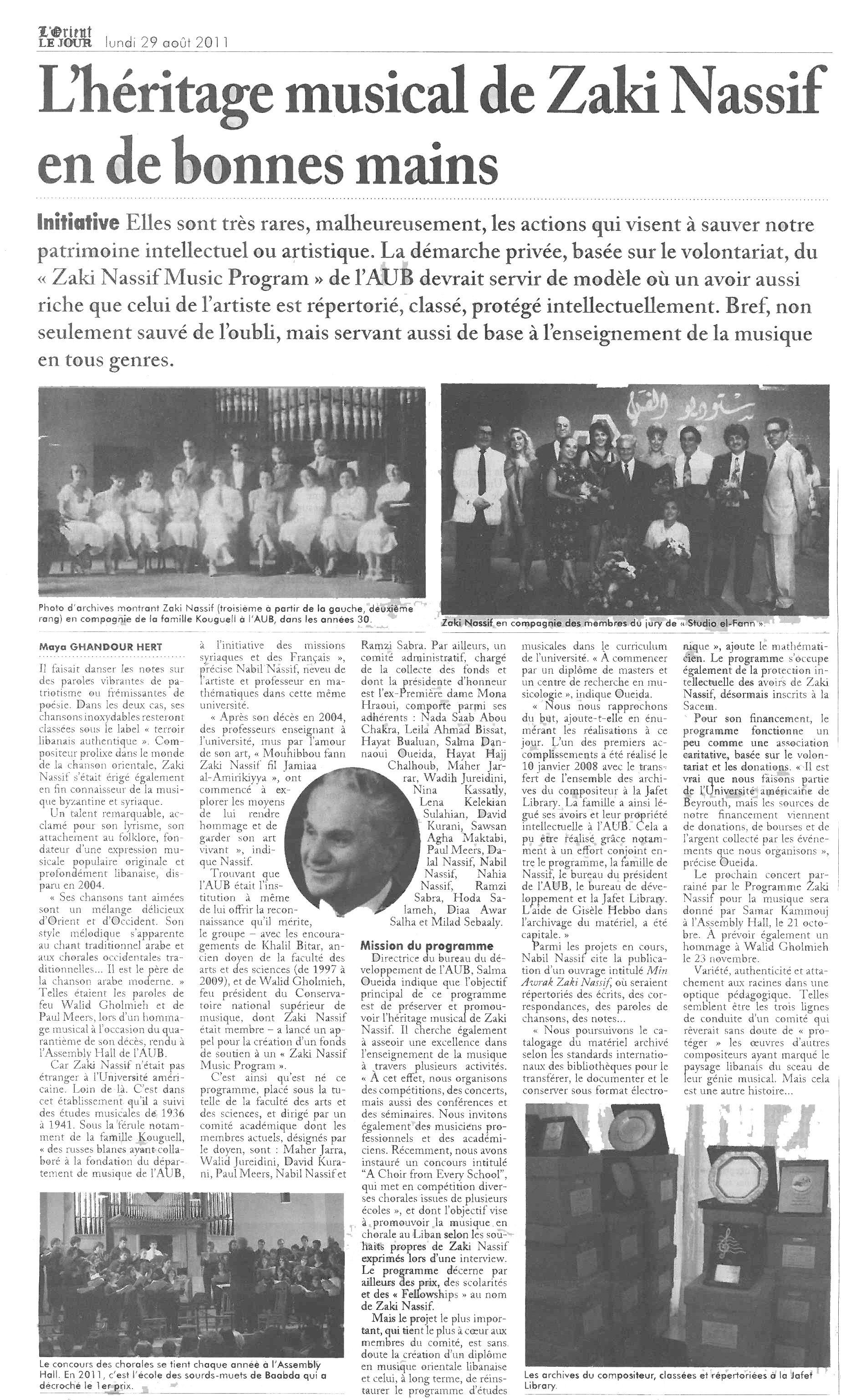 Born in Mashghara, in the southwest Bekaa region of Lebanon on July 4th 1916, Zaki Nassif was the son of Chaker Nassif, an industrial merchant, and Rashideh Ibrahim, a musically-sensitive mother who nurtured Zaki’s musicality in early life with her singing at home. Egyptian Sheikh Salama Hijazi’s singing of classical Arabic and both, Sheikh Mohamed Rifaat’s and Sheikh Mustafa Ismail’s reciting verses from the Holy Qur’an influenced his musical sensibilities that were further developed by his attendance of Syriac and Byzantine (Greek Orthodox) church services. His exposure to traditional dabkeh developed also his conviction that these Lebanese folkdances could be a true expression of collective celebration, of joy, and of solidarity, or “dalouna” . In 1920, during the early days of the French mandate in Syria and Lebanon, his family moved to the Beirut , the new capital of Lebanon. As the youngest of two girls and three boys, his childhood was happy during the years 1922 - 1933, despite the first family bankruptcy in 1925. During that period, he had his initial exposure to regional instruments, including the plucked-string “oud” and the “mijwez” flute. In 1933, a serious foot condition left him with a life-long handicap. It forced him to leave his high school studies at the French Lay Mission (presently the “Lycée Français”) at an early age and joined later on the “School of the Holy Saviour”. Zaki Nassif’s study of music began at the Institute of Music of the American University of Beirut in 1936. His instructors were made up largely of members of the Kouguell family: Arkadie and his wife taught him voice and piano, and Arkadies’ brother Rudolph taught him cello. The noted composer Toufic El Bacha (1924-2005) was also a close friend and colleague of Zaki Nassif during these days of study at AUB. Also, El Bacha’s uncle Khalil Maknieh mentored Zaki during that period. In spite of some interruptions caused by the family business, he remained at AUB until 1941 after which he continued his classical music studies with Bertand Robillard. As were many other students at AUB, he was affected by prevailing social and political ideas. These ideas deeply influenced his patriotic and social beliefs throughout his life, shaping up as well his musical outlook, characterized by a genuine interest in folk music, poetry and dance in addition to an encyclopedic knowledge of Byzantine & Syriac music traditions. A second family financial setback in 1949 had a strong effect on the composer, and following this event, he dedicated himself to the music profession. In doing so, he eventually contributed significantly to what became to be known as the "Lebanese Renaissance." This period was the beginning of a golden age for Lebanese-produced music in general and Lebanese folk-dance-influenced works in particular. Zaki Nassif, Toufic El Bacha, Philemon Wehbeh (1916-1985), Assi (1923-1986), husband of the famous singer Fairouz, and Mansour Rahbani (1923-2009) were among the leading components of this music. They, except Wehbe, also formed a quintet, with Abdel Ghani Chaaban (1925-1977) named ‘The League of Five’ that was modeled after the Russian circle of composers “The band of Five” (1856-1870) whose objective was to promote musical modernism along side the local musical identity. Their focal points were first Near East Radio (1953-1956) and Radio Liban in Beirut, then the Baalbeck festival in 1957 & 1959, in collaboration with Marwan and Wadiha Jarrar (1930-2011), Sabri Sherif (1922-1999), Badi' Boulos and others. These collaborations also played a significant role in the development of regional dance, in the form of formalized stage choreography for the dabkeh. In 1960, “The Story of Lebanon” performances were given by the Anwar Group, championed by the journalist Said Fraiha (1905-1978) and directed by Nizar Mikati: this time with only Zaki Nassif and Toufic El Bacha participating alongside Wadi’El Safi and Afif Redwan (1929- 1972). The Anwar Group ended their activities in 1964 after presenting another program at Baalbeck Festival entitled “Our Land Forever” preceded by three years of touring in the Arab countries and Europe. Starting from 1965, Zaki Nassif worked solo and achieved two major participations in the 1970 and 1974 Baalbeck festivals besides composing many songs for choruses, as well as for celebrated singers like Sabah, Wadi El Safi, Nasri Chamseddine (1927-1983), Majdala, Widad, Suad Hachem, Najah Salam, Samira Toufic and Joseph Azar. After the Lebanese War started, Nassif composed his masterpiece performed by Fairuz “Ya Banni Oummi” (1981) based on Gibran Khalil Gibran’s texts and continued his contribution to music in Lebanon with his more than a decade long collaboration with Caracalla Dance Troop and writer Antoine Ghandour for theatre and TV. He also worked with a new generation of singers like Majida El Roumi, Ghassan Saliba, Ali Hleihel and others. One of his most important and influential songs of the late 1980s was “Raje'h Yit'Ammar Loubnan”, for which he wrote both words and music. In Lebanon, it became an extremely popular song, rivaling even the national anthem. This afforded him nation-wide recognition and generous and significant royalties from the Lebanese Broadcasting Corporation that supported him for the remaining years of his life. His last masterpiece, lyrics and music, is "Mahma Yitajrah Bladna", that expresses passion and sincerity for the plea of his homeland, after the first Qana massacre in 1996. Zaki Nassif died on March 11, 2004, leaving a rich and vibrant musical heritage consisting of about 1,100 of songs and pieces of music belonging to various genres and styles. He may be considered the founder of a new Lebanese Arabic school of compositions, unique in a genre that combines words, music, orchestration and dance.