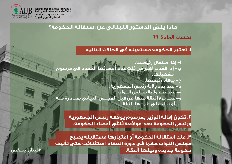 ماذا ينصّ الدستور اللبناني عن استقالة الحكومة؟ Thursday, October 24, 2019 Page Contentيضيئ معهد عصام فارس في الجامعة الأميركية في بيروت على بعض المواد الدستورية والقانونية المرتبطة بالمطالب الشعبية المطروحة خلال المظاهرات.