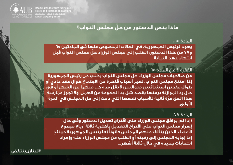 ماذا ينص الدستور عن حلّ مجلس النواب؟ Thursday, October 24, 2019 HomeAbout Us About UsStaffInstitute FellowsAffiliates ProgramNetworks and PartnershipsNadim Makdisi Memorial Fund Clusters Sustainability and Inclusive DevelopmentLebanon in the World: Regional and International AffairsPolicy, Politics, and Governance Publications PublicationsNewsletter Events Recent Events (2018 - present)Latest Events (2018 - present)Past Events (2006-2018) News Press ReleasesNewsCurrently selectedIFI In The News Previous ProgramsOpportunitiesContact UsRecent Page Contentيضيئ معهد عصام فارس في الجامعة الأميركية في بيروت على بعض المواد الدستورية والقانونية المرتبطة بالمطالب الشعبية المطروحة خلال المظاهرات.