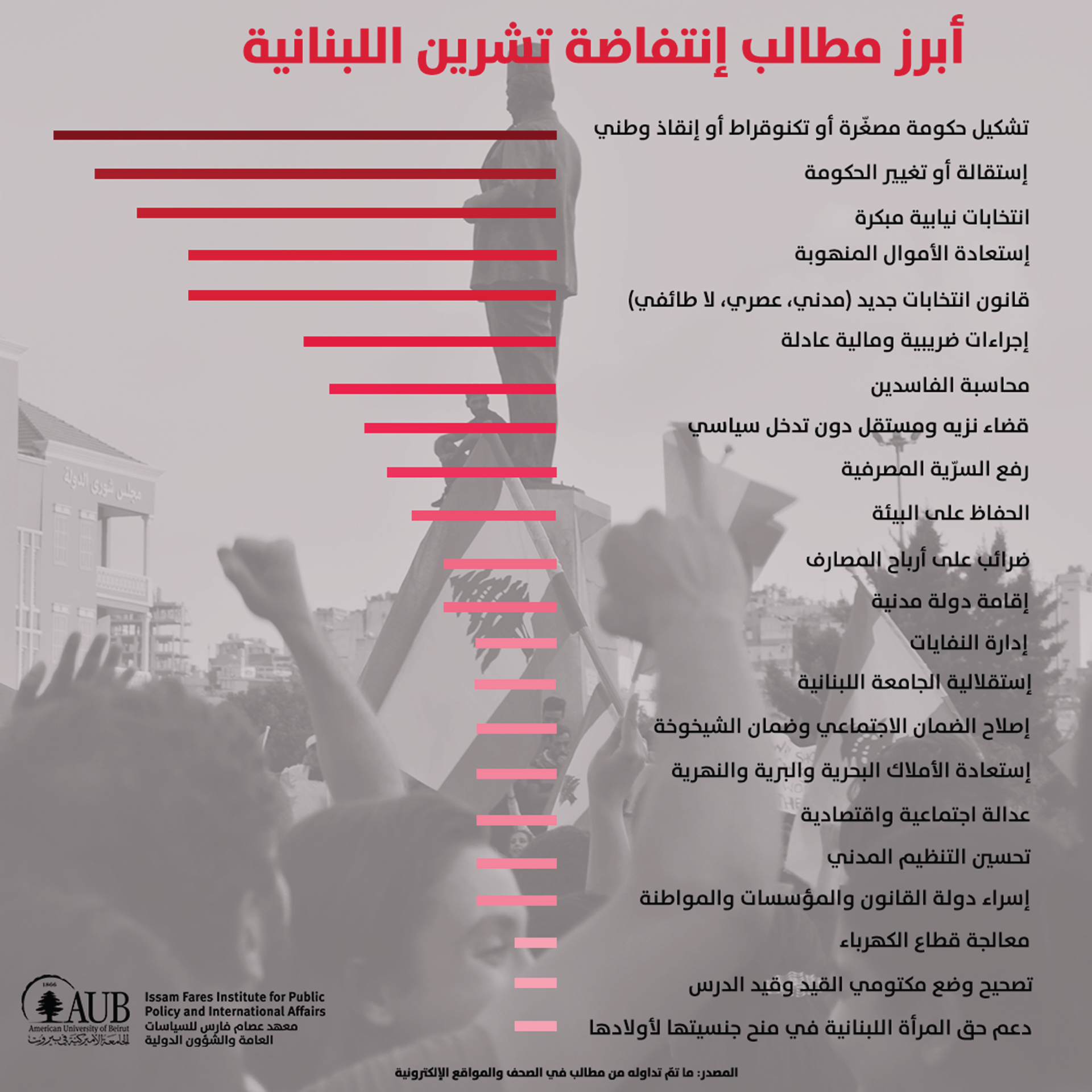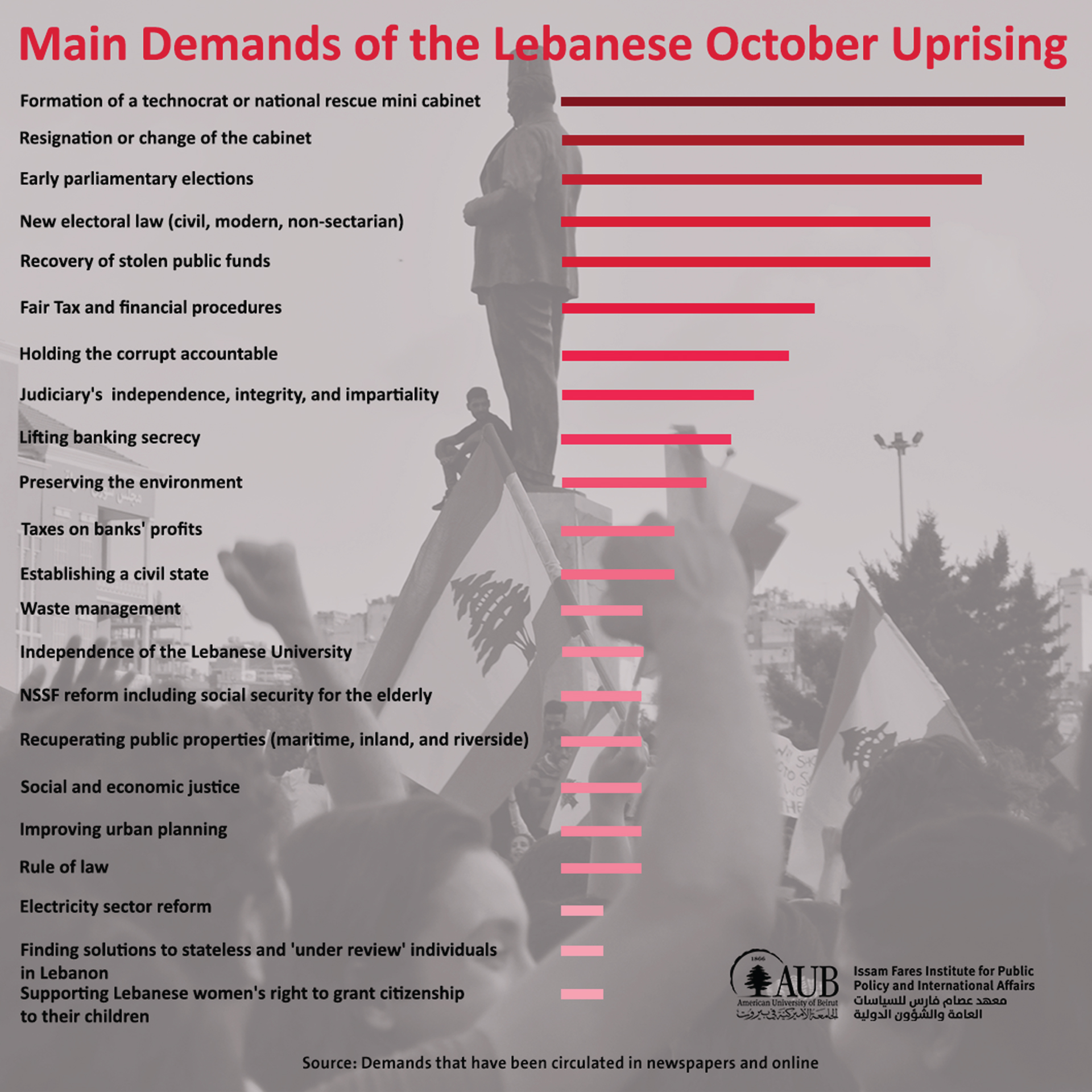 In an attempt to highlight and understand the demands of protesters of the October Uprising in Lebanon, the AUB Issam Fares Institute for Public Policy and International Affairs (IFI) is publishing a series of visuals featuring the results of a desk review of the demands presented by selected groups who participated in the Uprising, including those who had set up tents in Martyr's Square and Riad El Soloh, Beirut.