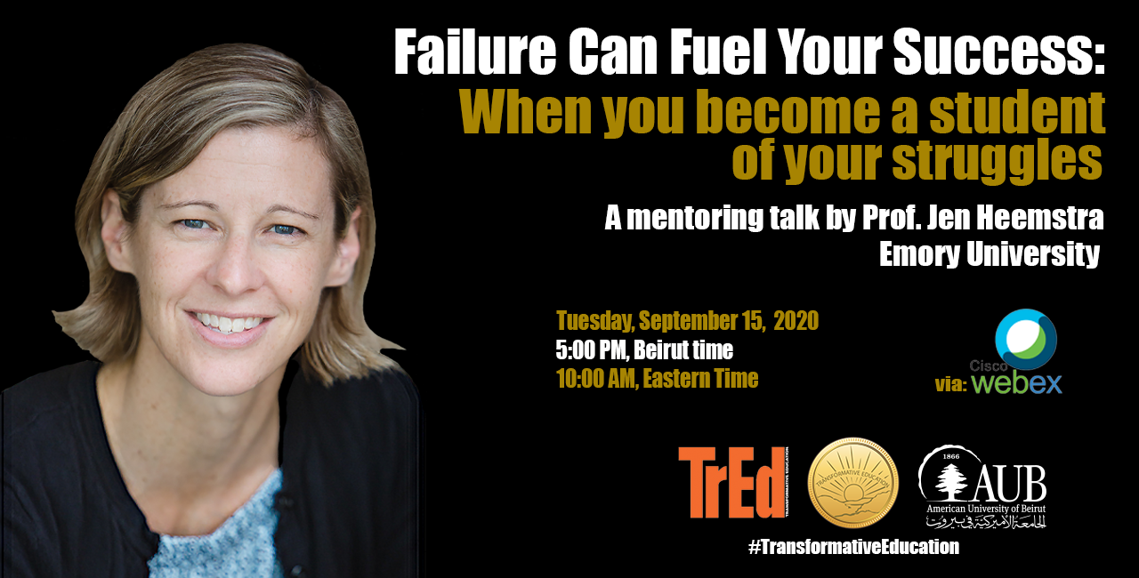 Prof. Jen Heemstra of Emory University delivered a mentoring talk entitled, "Failure Can Fuel Your Success: When You Become a Student of Your Struggles" via WebEx on Sep 15, 2020. In her own words, “Success may be defined by the moments when everything is going right, but it's largely determined by what we do in the moments when everything is going wrong".
