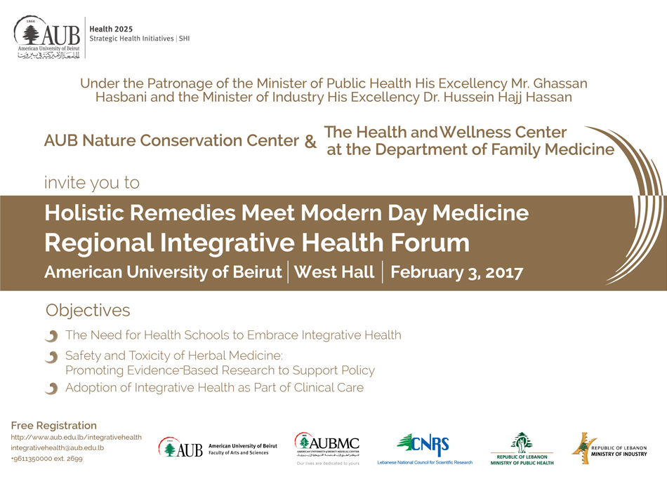 As a component of AUB's Health 2025 Vision, the AUB Nature Conservation Center (NCC) organized the Regional Integrative Health Forum. Led by Dr. Najat Saliba, director of the NCC, and Dr. Maya Romani, head of the Health and Wellness Center at AUBMC's Department of Family Medicine, the conference attempted to tackle tough questions. The all-day forum was held under the patronage of the Minister of Public Health and the Minister of Industry.